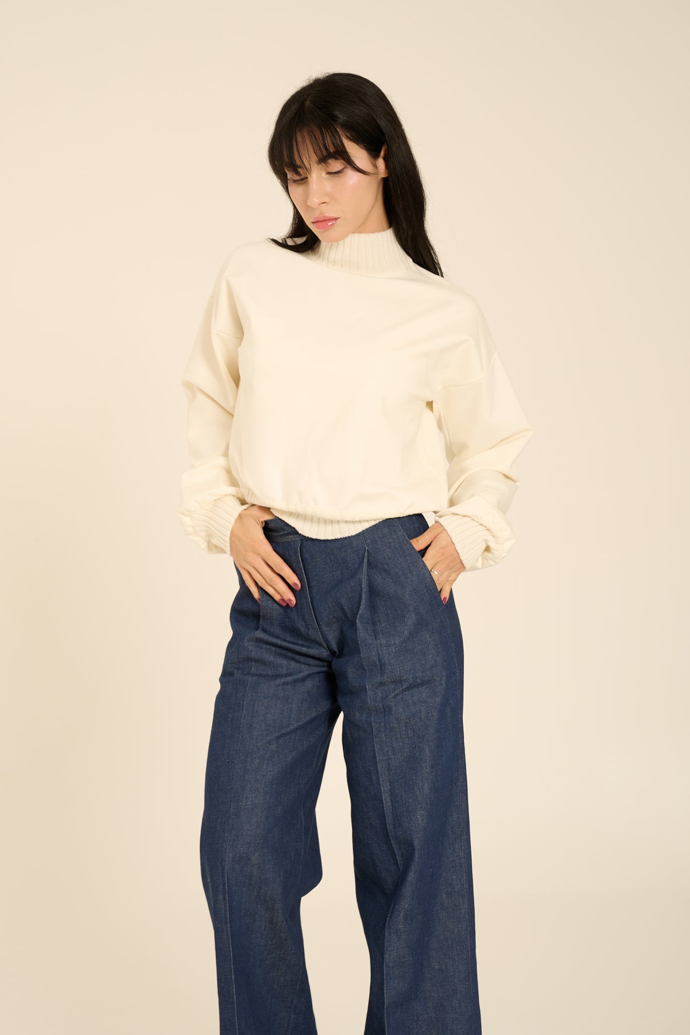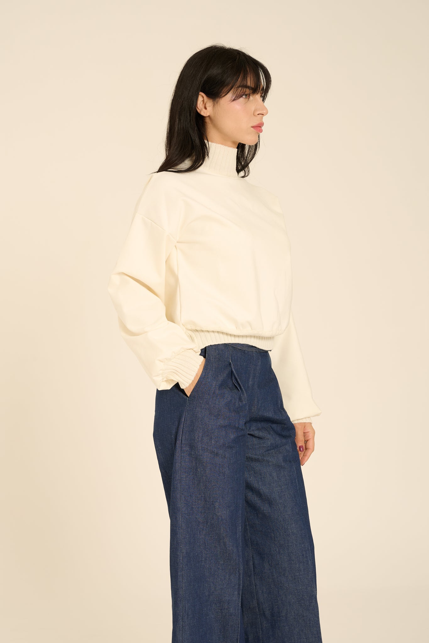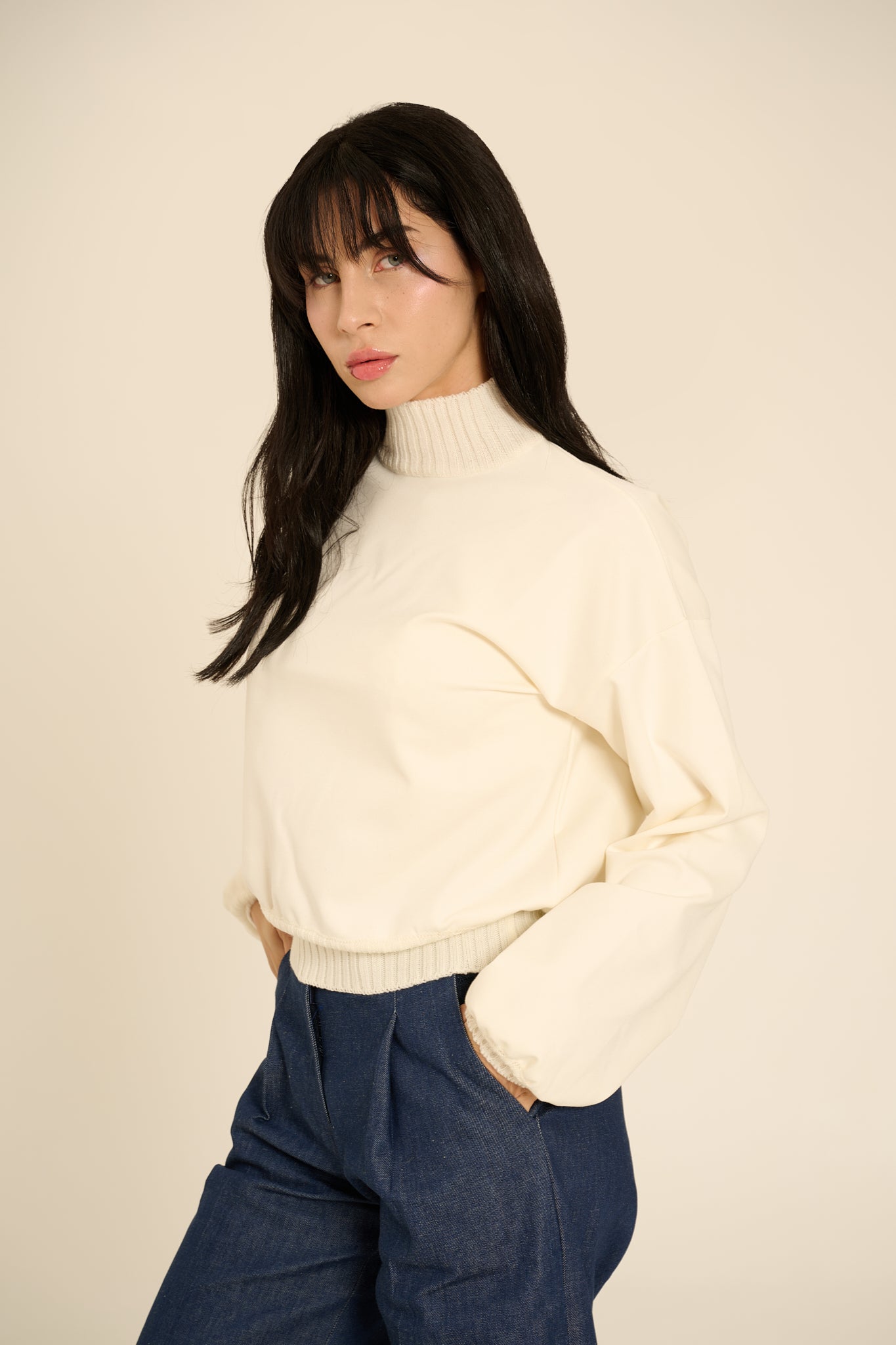 Felpa in cotone pesante. Modello over con maniche ampie a sbuffo. Collo alto, polsino e fondo maglia in elastico lavorato a costine in maglia. Vestibilità morbida, over.